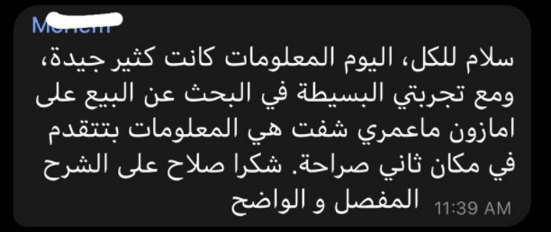 لذلك إتخذت من كسر عجلة التجارب الغير ناجحة مهمة أساسية في رحلتي وبحكم خبرتي حتى أتمكن من مساعدة الراغبين بتحقيق دخل مادي إضافي وتعزيز ثقتهم بأنفسهم عبر تمكين الفرد من اطلاق اول منتج وكسب اول دولار من النت باستخدام طريقتي المثبتة في بيع المنتجات في امازون.
